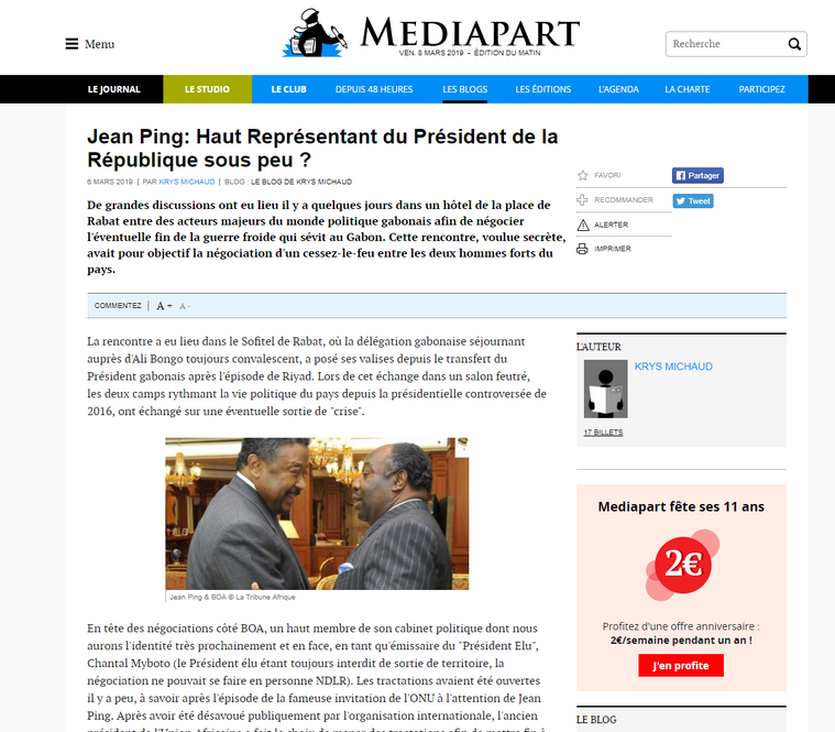 Le Cabinet du Président de la République élu Jean PING a pris connaissance d’un post publié le 6 mars 2019 sur le blog d’un certain Chrys Michaud sur le site de Médiapart. Ce post fait état de discussions qui se seraient tenues à Rabat entre un envoyé du Président de la République élu Jean PING et les représentants des putschistes en vue d’un arrangement entre les deux parties.