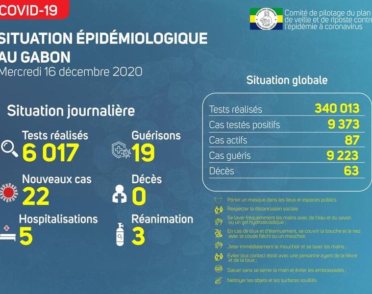 Gabon Matin vous livre le point journalier du Comité de pilotage du plan de veille et de riposte contre l’épidémie à Coronavirus au Gabon du 16 décembre 2020.