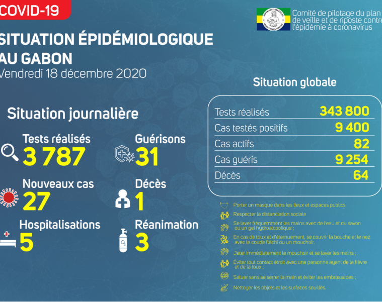 Gabon Matin vous livre le point journalier du Comité de pilotage du plan de veille et de riposte contre l’épidémie à Coronavirus au Gabon du 18 décembre 2020.