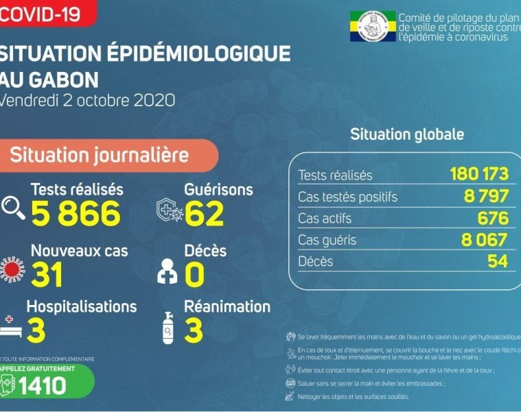 Gabon Matin vous livre le point journalier du Comité de pilotage du plan de veille et de riposte contre l’épidémie à Coronavirus au Gabon du 2 octobre 2020.