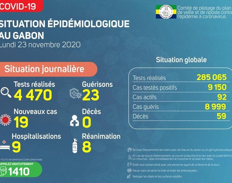 Gabon Matin vous livre le point journalier du Comité de pilotage du plan de veille et de riposte contre l’épidémie à Coronavirus au Gabon du 23 novembre 2020.