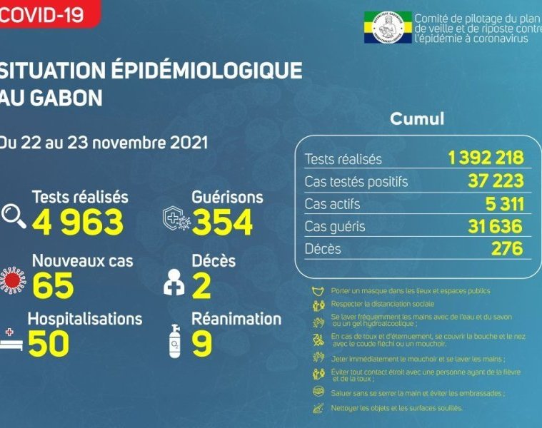 Nous avons enregistré 65 nouveaux cas positifs sur 4 963 tests réalisés, soit un taux de positivité de 1.3%, 50 personnes hospitalisées dont 09 en réanimation pour détresse respiratoire, 354 nouvelles guérisons et 02 nouveaux décès à Libreville.