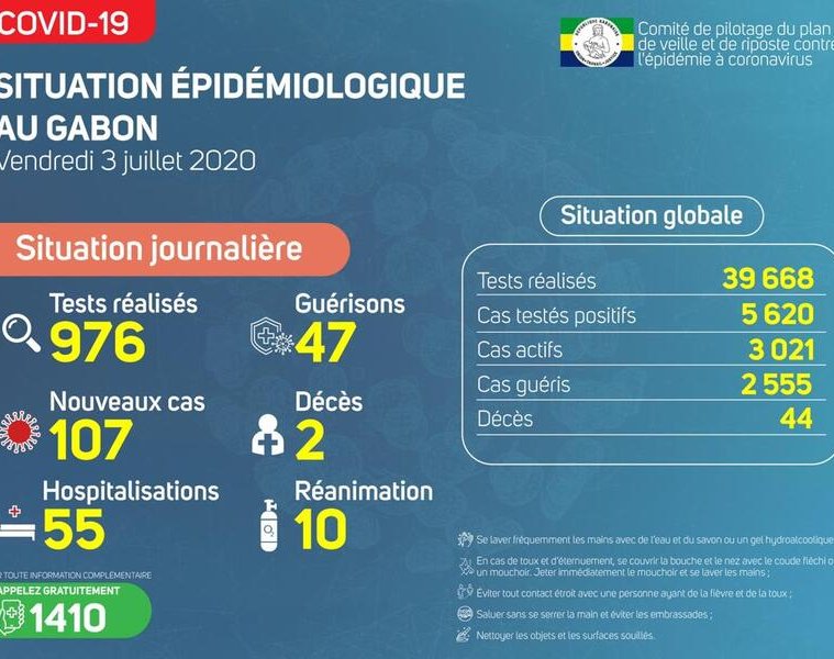 La situation épidémiologique sur la pandémie de la Covid-19 au Gabon, des journées de jeudi 2 et vendredi 3 juillet 2020, est la suivante :