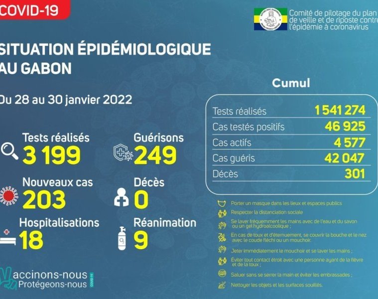 GabonMatin vous livre le point journalier du Comité de pilotage du plan de veille et de riposte contre l’épidémie à Coronavirus au Gabon du 30 janvier 2022.