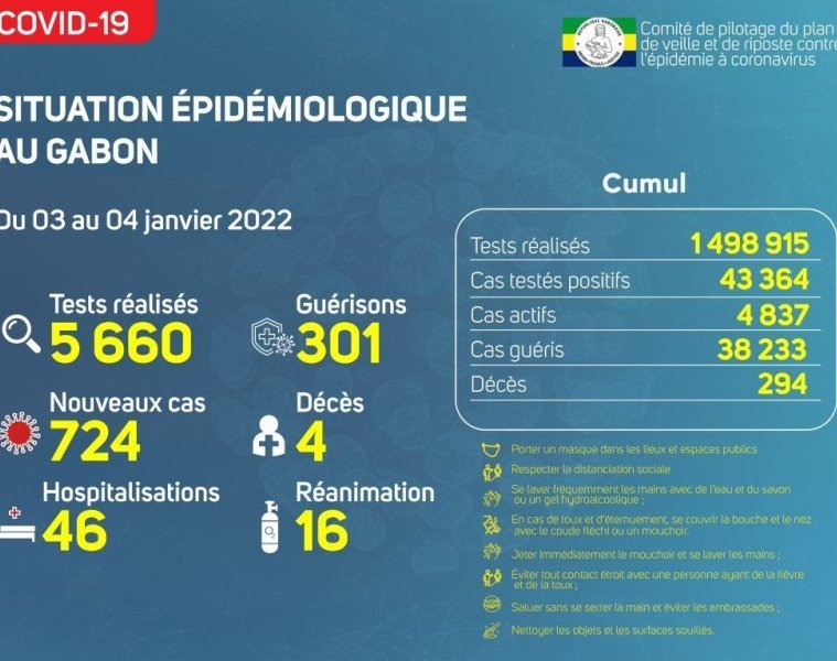 GabonMatin vous livre le point journalier du Comité de pilotage du plan de veille et de riposte contre l’épidémie à Coronavirus au Gabon du 4 janvier 2022.