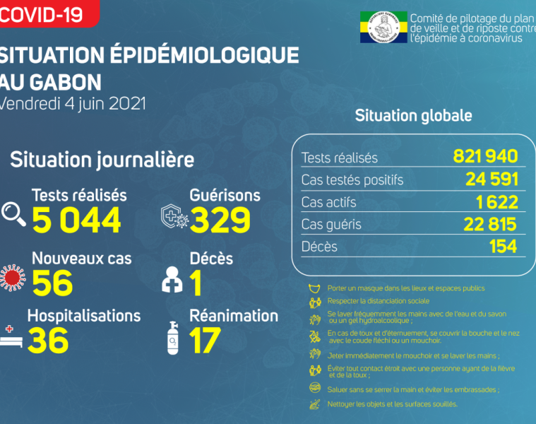 Gabon Matin vous livre le point journalier du Comité de pilotage du plan de veille et de riposte contre l’épidémie à Coronavirus au Gabon du 4 juin 2021.