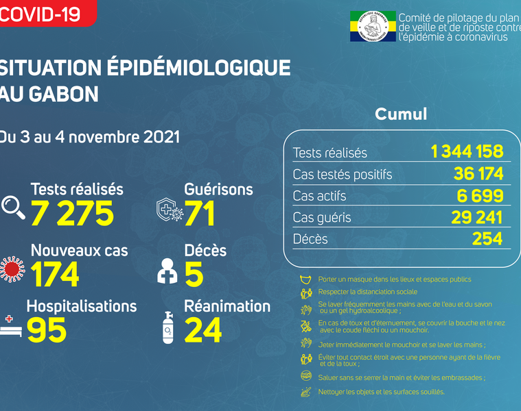 Nous avons enregistré 174 nouveaux cas positifs sur 7 275 tests réalisés, soit un taux de positivité de 2.4%, 95 personnes hospitalisées dont 24 en réanimation pour détresse respiratoire, 71 nouvelles guérisons et 05 nouveaux décès dont 04 à Libreville et 01 à Port Gentil.