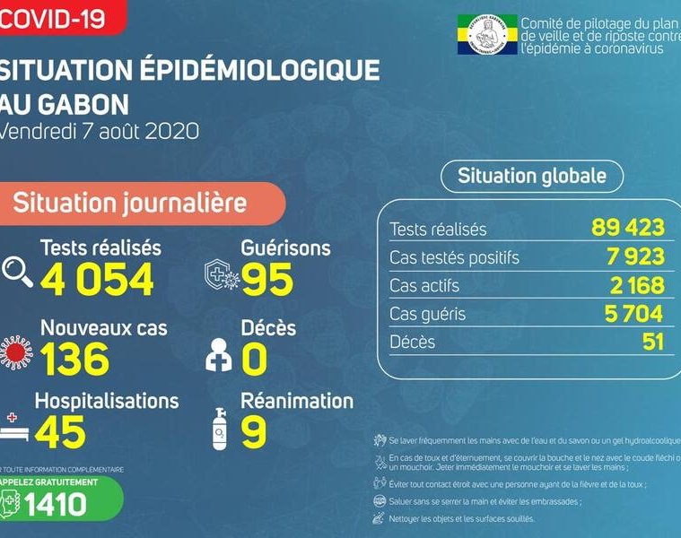 Gabon Matin vous livre le point journalier du Comité de pilotage du plan de veille et de riposte contre l’épidémie à Coronavirus au Gabon du 7 août 2020.