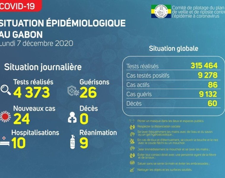 Gabon Matin vous livre le point journalier du Comité de pilotage du plan de veille et de riposte contre l’épidémie à Coronavirus au Gabon du 7 décembre 2020.