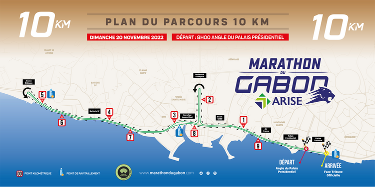 À l’issue de cette activité, voici les nouveaux parcours : Pour le 10 km, après le départ à l’angle du Palais présidentiel, les coureurs tourneront à droite au carrefour des Affaires étrangères puis monteront le boulevard Triomphal, pour faire demi-tour au niveau de l’Institut français du Gabon. Ensuite, ils reprendront le Bord de mer jusqu’à l’ancien Dialogue, au KM5, où ils feront demi-tour pour un retour par le Bord de mer jusqu’à la tribune officielle.