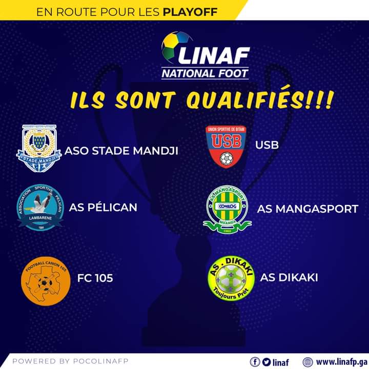 Au terme de cette phase dite régulière, ce sont les trois meilleurs clubs des deux poules du National Foot 1 que sont l’Association Sportive Omnisport Stade Mandji de Port-Gentil (26 ponts), l’Association sportive de Pélican de Lambaréné (18 points) et du Football Canon 105 (17 points) pour la poule A et l’Union Sportive de Bitam (26 points), l’Association Sportive Mangasport de Moanda (21 points) et l’Association Sportive Dikaki de Fougamou (19 points) de la poule B qui ont su tirer leur épingle du jeu en se positionnant dans les trios qualificatifs.